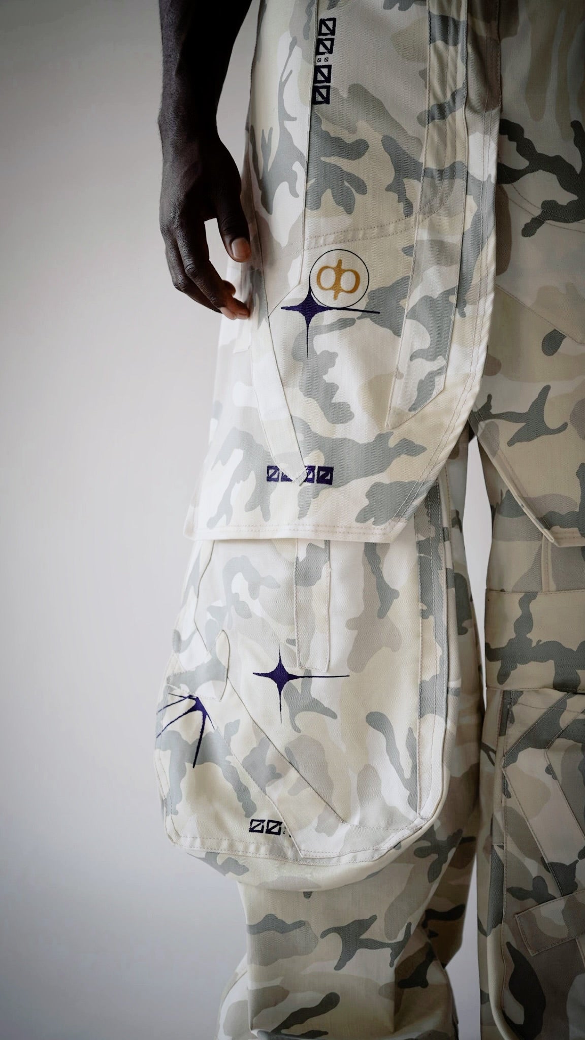 Off-white colored camo pants printed and sewn completely from scratch. Reconstructed front panels that give the pants a unique yet subtle style.